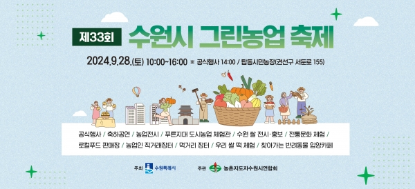[금요저널] 농업인과 도시민이 함께하는 ‘도농 화합의 장’인 제33회 수원시 그린농업축제가 9월 28일 오전 10시부터 오후 4시까지 탑동시민농장에서 열린다.