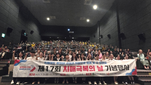 제17회 치매극복의 날 행사는 롯데시네마 오산 원동점에서 진행됐으며 △치매극복의 날 기념‘달임씨를 부탁해’ 영화 관람 △치매예방 수칙 3.3.3.과 치매 예방 실천을 다짐하는 ‘함께 해요, 치매예방 퀴즈’ △치매안심센터의 치매어르신과 그 가족이 직접 만든 작품 전시회 등 다양한 구성으로 이뤄졌다.
