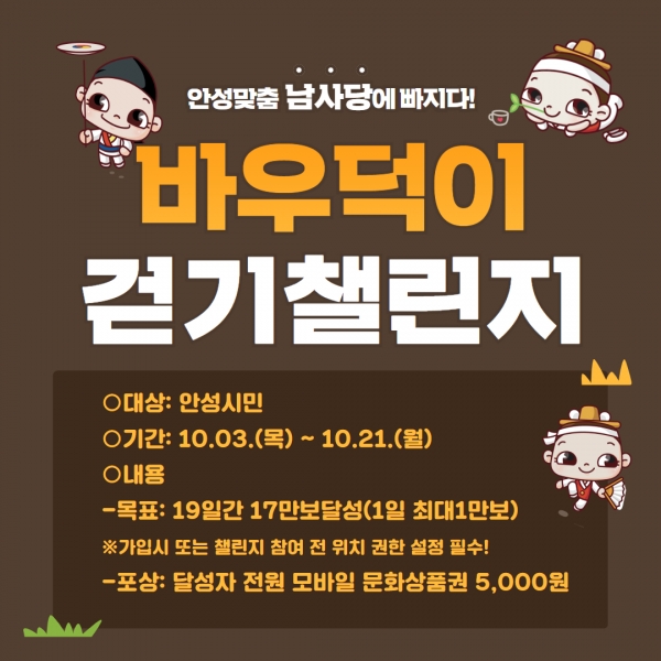 안성시보건소 관계자는 “이번 걷기챌린지로 시민들이 바우덕이 축제에 참여하고 걷기 습관을 정착하는 즐겁고 건강한 생활의 계기가 되길 바란다”고 전했다.