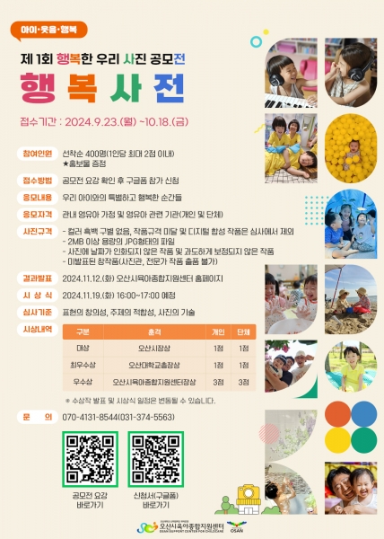 사진 분야‘행복사전’의 응모자격은 오산시 영유아 가정 및 영유아 관련 기관으로 우리 아이와 특별하고 행복한 순간을 담은 사진을 주제로 1인 2점까지 출품할 수 있다.