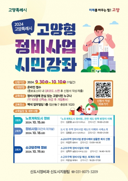[금요저널] 고양특례시는 오는 10월 15일부터 19일까지 ‘2024년 고양형 정비사업 시민강좌’를 운영한다고 밝혔다.