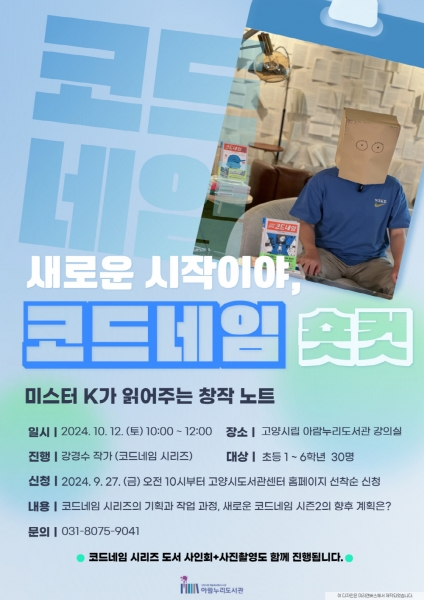 초등 1~6학년 30명을 대상으로 10월 12일 토요일 오전 10시부터 12시까지 아람누리도서관 강의실에서 수업이 진행될 예정이며 참여 신청은 고양시도서관센터 누리집에서 가능하다.