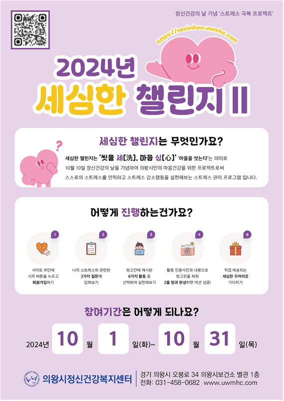 임인동 의왕시보건소장은 “삶의 면역력과 평온함을 위해서는 스트레스 관리가 중요하다”며 “세심한 챌린지Ⅱ에 적극 참여하셔서 일상 속에서 정신 건강 관리를 실천하길 바란다”고 말했다.