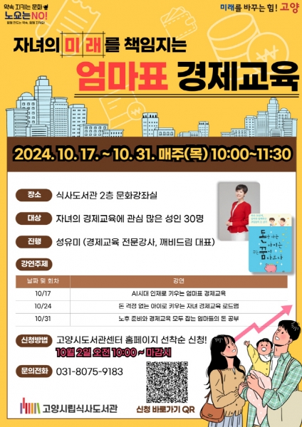 [금요저널] 고양특례시 식사도서관은 오는 10월 17일부터 10월 31일까지 저자특강‘자녀의 미래를 책임지는 엄마표 경제교육’을 운영한다.