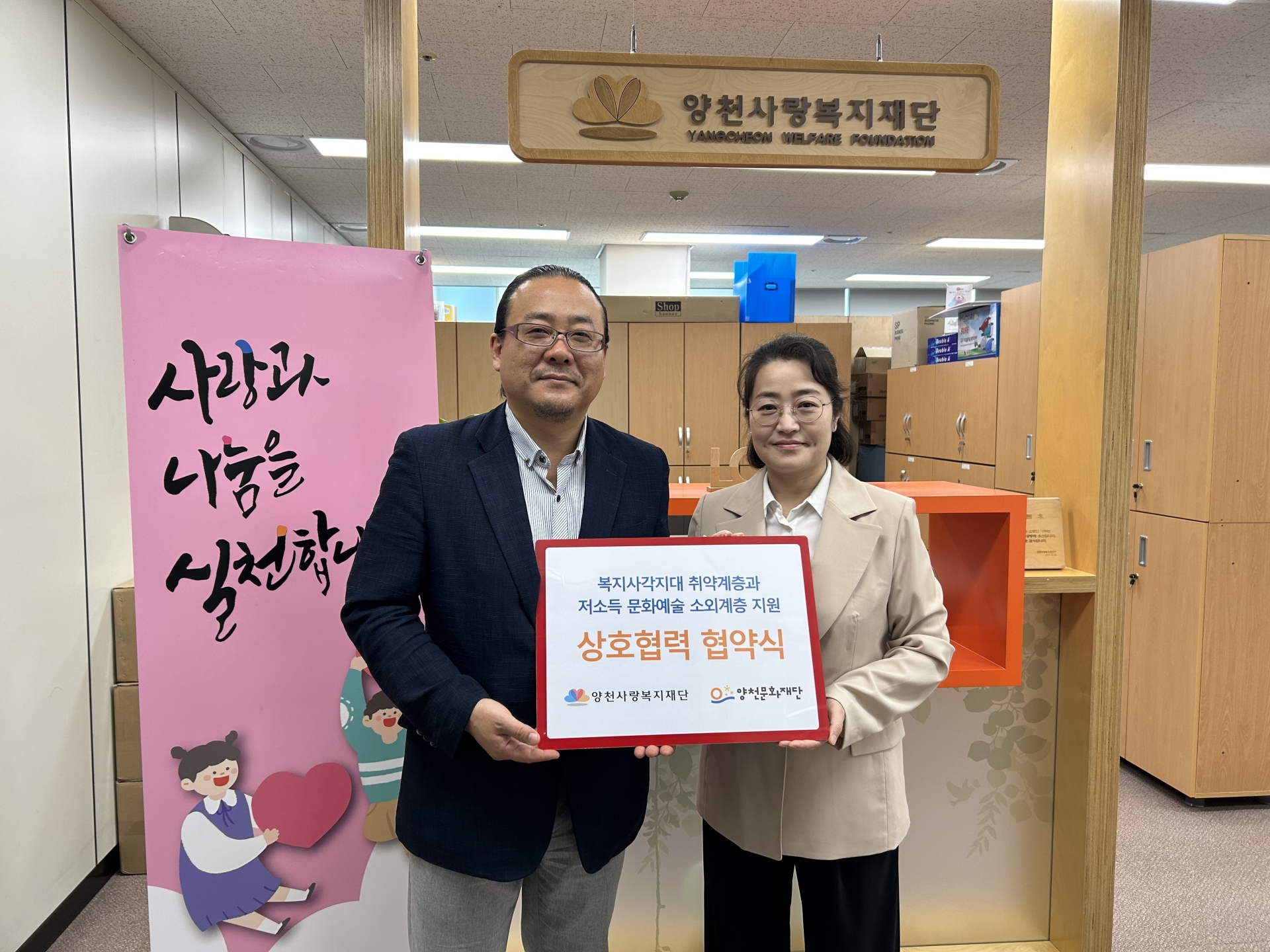 양천사랑복지재단(이사장 윤영민)과 양천문화재단(이사장 천동희)이 양천사랑복지재단 사무실에서 업무 협약식을 갖고, 복지사각지대 취약계층과 저소득 문화예술 소외계층 주민을 위해 공동 협력하기로 합의했다.