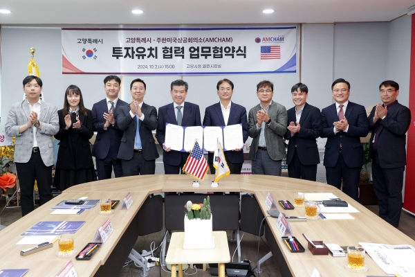 [금요저널] 고양특례시는 자족도시 실현을 위한 투자유치 촉진을 위해 주한미국상공회의소와 상호 협력을 위한 업무협약을 지난 2일 시청 열린시장실에서 체결했다고 밝혔다.
