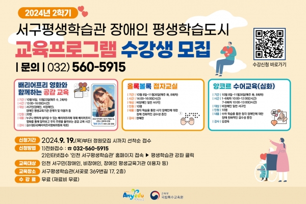 [금요저널] 인천 서구는 인천 최초 장애인 평생학습도시 지정 운영의 일환으로 ‘장애인 평생학습도시 2학기 프로그램 수강생 모집’을 오는 10월 10일까지 선착순으로 진행한다고 밝혔다.