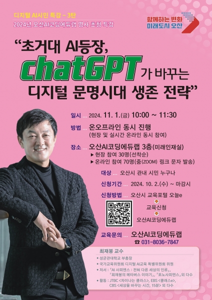 [금요저널] 오산시는 11월 1일 오산AI코딩에듀랩에서 ‘초거대 AI 등장, chatGPT가 바꾸는 디지털 문명시대 생존 전략’을 주제로 명사 초청 디지털 AI시민 특강을 진행한다.