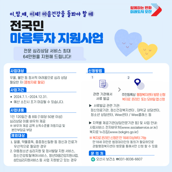 오산시 ‘전국민 마음투자 지원사업’, 온라인 신청가능