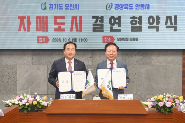 [금요저널] 오산시와 경북 안동시가 8일 오산시청 상황실에서 자매결연 협약식을 맺고 상생발전 및 공동발전 협력 강화에 나서기로 했다.