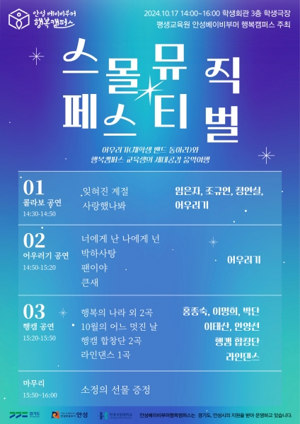 이번에 개최되는 스몰 뮤직 페스티벌은 안성베이비부머행복캠퍼스의 교육생들과 한경국립대학교 재학생으로 구성된 밴드 동아리 어우러기가 공동으로 준비한 문화행사이다.