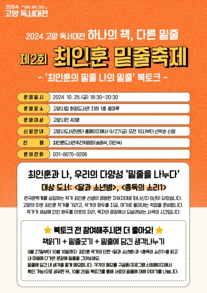 밑줄축제는 9~10월에 미리 책을 읽으며 그은 밑줄을 온라인으로 공유한 뒤, 10월 25일 화정도서관 지하 1층 꽃마루에서 진행하는 북토크로 이어진다.