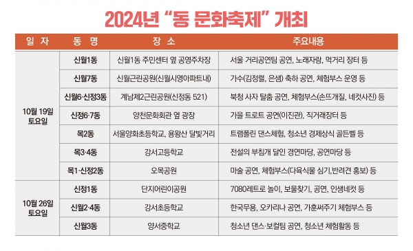 [금요저널] 양천구는 축제의 계절 10월을 맞아 지역 곳곳에서 가을을 만끽할 수 있도록 기존 동별 문화축제를 생활권 통합 ‘동 문화축제’로 확대·개편해, 오는 19일과 26일 양일간 10개 지역에서 동시 개최한다고 밝혔다.