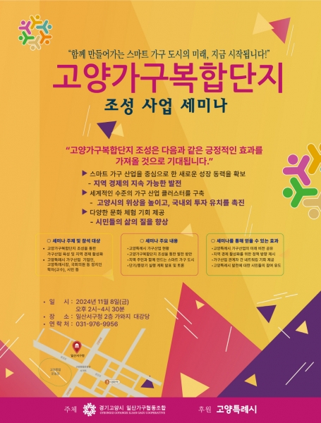 [금요저널] 경기고양시 일산가구협동조합은 고양특례시 후원으로 오는 11월 8일 오후 2시부터 4시 30분까지 일산서구청 가와지대강당에서 '고양가구복합단지 조성사업 세미나'를 개최한다.
