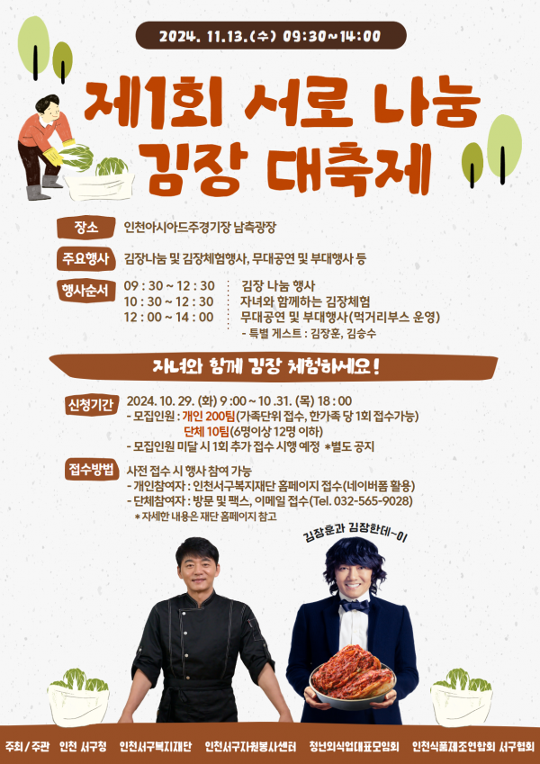 이번 행사는 매년 지역사회를 위해 김장 나눔 행사를 했던 서구자원봉사센터, ㈜단지FnB와 청년외식업대표모임회, 인천식품제조연합회 서구협회가 공동으로 주관하며 바르게살기운동인천서구협의회, 인천서구새마을회, 23개동 자생단체 등 여러 단체들이 참여할 예정이다.