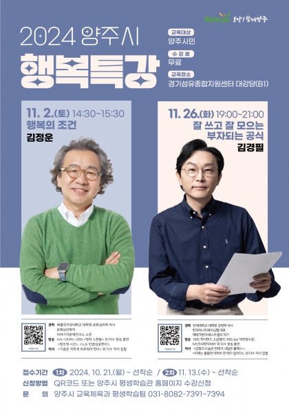 [금요저널] 양주시가 오는 11월 문화심리학자 김정운 박사, 금융·경제 전문가 김경필 머니트레이너와 함께 시민들과 경험과 지식을 나누는 ‘2024 양주시 행복특강’을 개최한다고 밝혔다.
