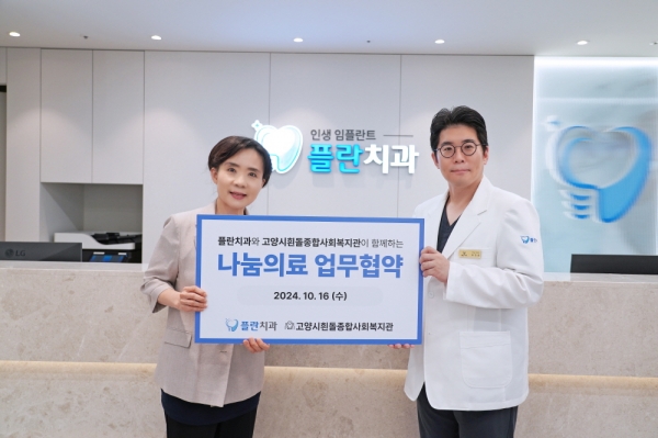 [금요저널] 고양시흰돌종합사회복지관과 플란치과의원 일산점은 지역 취약계층의 구강 보건 증진을 위한 프로젝트 사업의 일환으로 지난 16일 치아 손실로 도움이 필요한 사회적 취약계층에게 무료 임플란트 수술과 사후 관리를 지원하는 의료봉사협약을 체결했다.