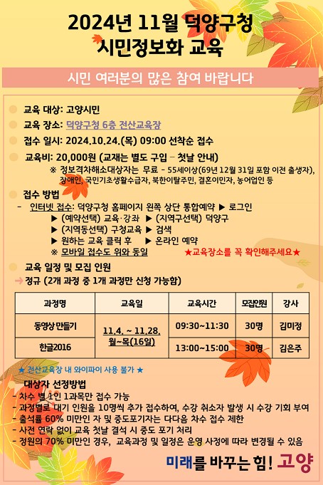 교육은 덕양구청 6층 전산교육장에서 진행되며 접수는 덕양구청 누리집에서 온라인으로만 가능하다.