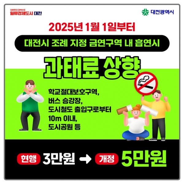 [금요저널] 대전시는 ‘금연구역 지정 등 흡연피해 방지 조례’일부 개정에 따라 조례에서 지정한 금연구역에서 흡연 시 부과하는 과태료를 2025년 1월 1일부터 기존 3만원에서 5만원으로 상향 적용한다.