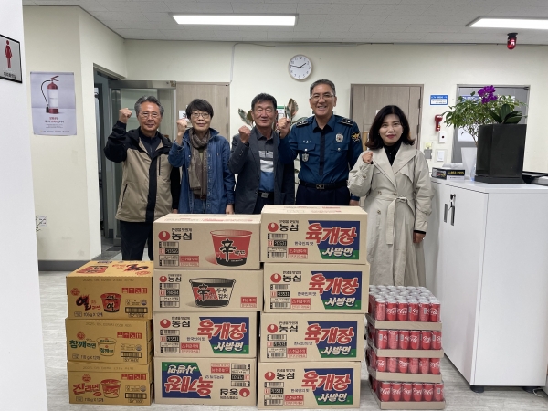 이날 방문 행사에는 박혜련 양주1동장, 조을석 고읍 지구대장, 정현호 시의원 등이 참석한 가운데 지역의 범죄 예방과 치안 강화를 위해 고생하는 지구대원들을 격려하며 컵라면 212개, 음료 96개를 전달했다.