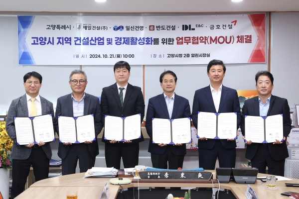 [금요저널] 고양특례시는 지난 21일 지역 건설산업 및 경제 활성화, 지역 일자리창출에 기여하기 위해 ‘고양장항지구’ 와 ‘풍동2지구’의 건설사인 제일건설㈜, 일신건영㈜, ㈜반도건설, 디엘이앤씨㈜, 금호건설㈜과 업무협약을 체결했다고 밝혔다.