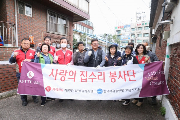 [금요저널] 롯데건설 샤롯데봉사단과 한국자유총연맹 의왕시지회는 21일 의왕시 오전동에 거주하는 저소득 장애인 가정을 방문해 집수리 봉사활동을 펼쳤다.