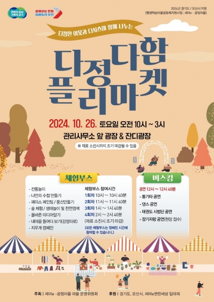 [금요저널] 오산시 세마e공정마을은 오는 26일 세마e-편한세상 아파트에서 ‘다정한 이웃과 다시쓰며 함께 나누는’‘다정다함 플리마켓’을 개최한다.
