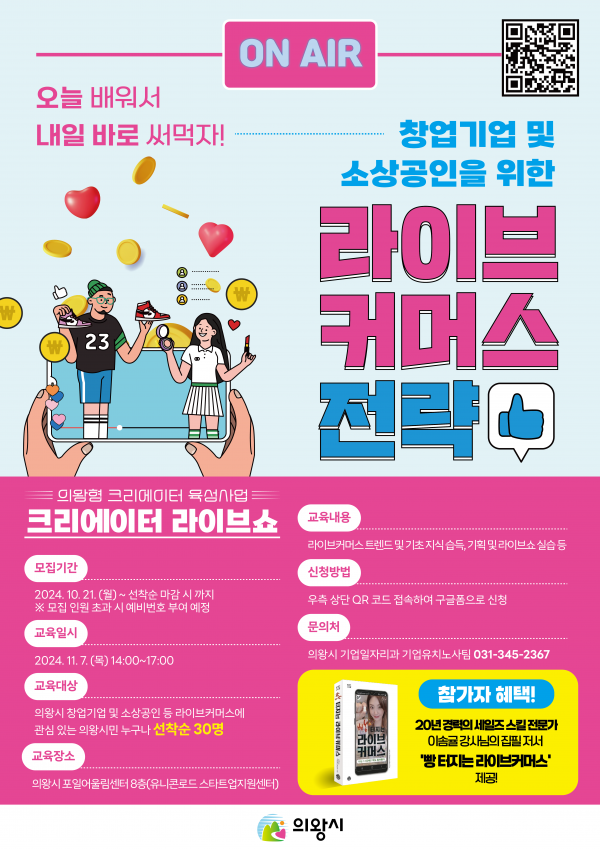 크리에이터 라이브쇼는 11월 7일 오후 2시부터 의왕시 포일어울림센터 8층 스타트업지원센터 오픈세미나실에서 진행되며 관내 창업기업과 소상공인, 그리고 라이브커머스에 관심 있는 누구나 신청할 수 있다.