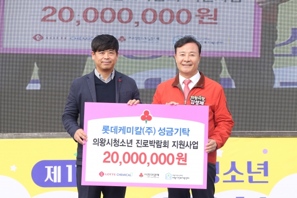 제11회 의왕시청소년진로박람회 현장에서 진행된 이날 성금 전달식에는 의왕시청소년재단 이사장인 김성제 의왕시장, 원억희 대표이사를 비롯해 롯데케미칼 조창근 수석, 경기 사랑의열매 김효진 사무처장 등이 참석했다.