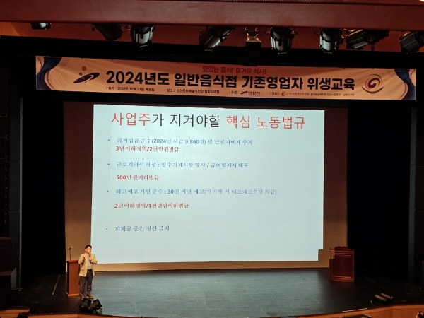 한국외식업중앙회 안산시지부 주관으로 열린 이번 교육에서는 △식품위생법 및 정책방향 △식품안전관리 방법 △노무 교육 등 일반음식점 운영에 필요한 법률 해석 △식품 안전사고를 예방하기 위한 위생 관리법 등에 관한 내용으로 진행됐다.