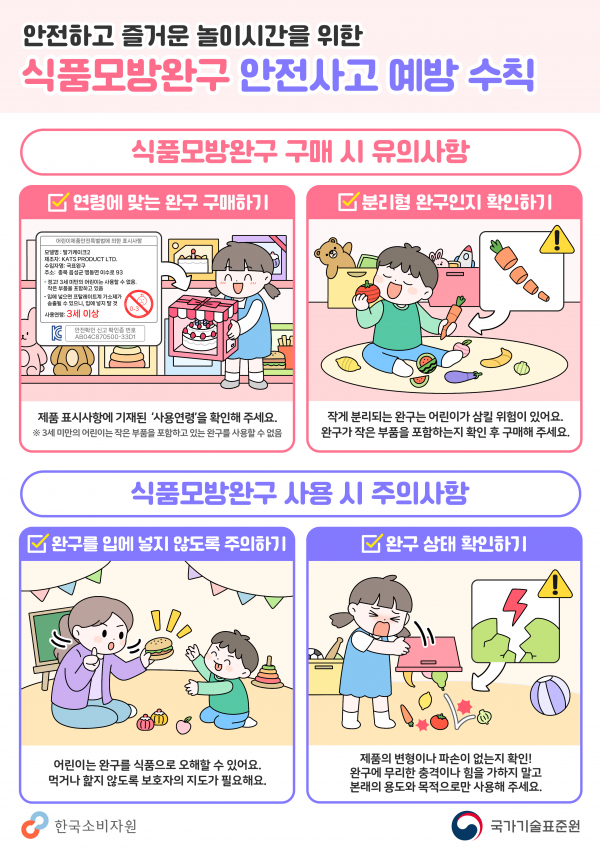 특히 식품과 유사한 모양으로 제작된 완구는 어린이가 식품으로 오인하거나, 작은 부품이 분리되어 삼키는 등의 사고 발생 우려가 있어 완구 구매와 사용 시 안전수칙을 숙지해 사고를 예방하는 것이 필수적이다.