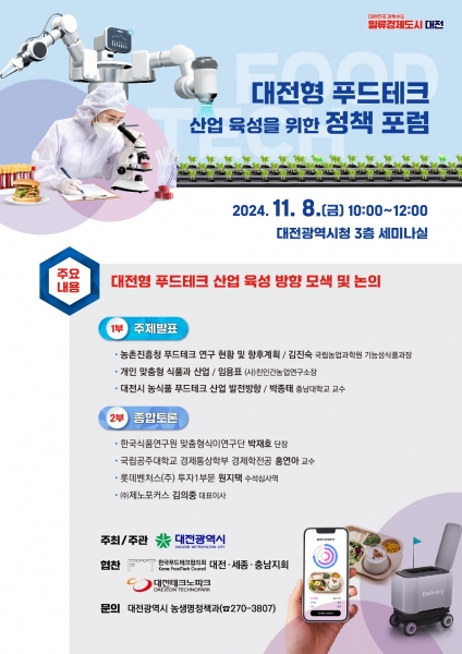 [금요저널] 대전시는 8일 오전 10시 대전시청 세미나실에서 ‘푸드테크 정책포럼’을 개최한다.