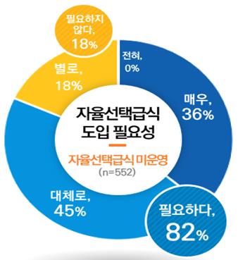 또한 운영교 학생 96%가 자율선택급식을 계속 운영해야 한다고 긍정 응답했으며 미운영교에서도 학생 82%가 자율선택급식 도입이 필요하다고 공감했다.