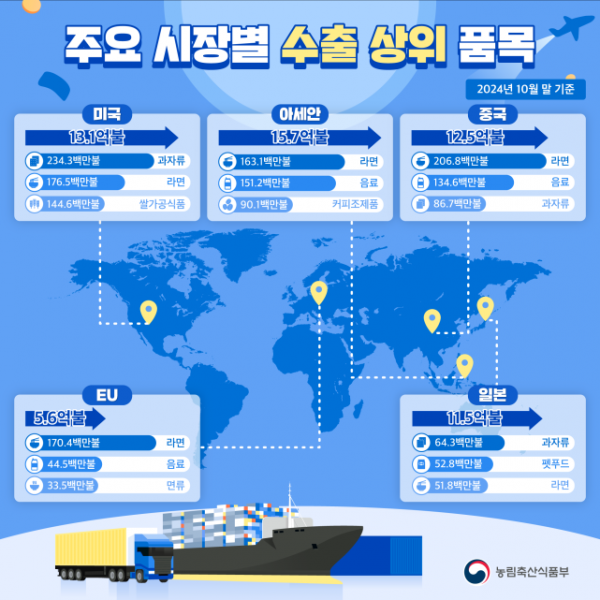 [금요저널] 농림축산식품부는 2024년 10월말 기준 농식품 수출 누적액이 지난해보다 8.9% 증가한 81억 9천만불을 기록했다고 밝혔다.