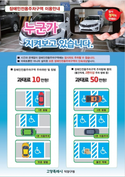 이에 덕양구에서는 장애인전용주차구역 위반에 관한 내용을 알리고 시민 인식을 개선하기 위해 전단지, 현수막 홍보 등 다양한 채널을 이용해 지속적인 홍보활동을 추진하고 있다.