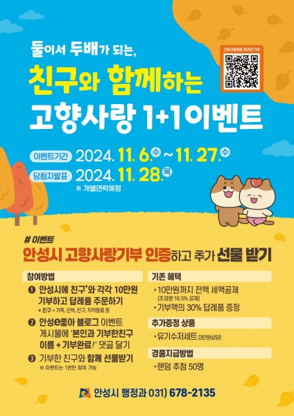 [금요저널] 안성시가 11월 6일부터 27일까지 친구와 함께 기부하고 함께 선물받는, 둘이서 두배가 되는 고향사랑 1+1 이벤트를 추진한다.