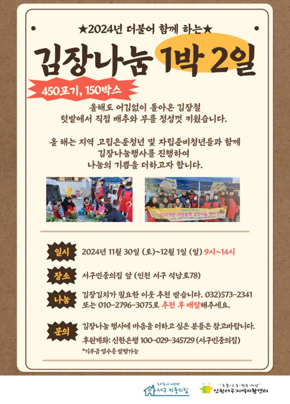 ‘더불어 함께 하는 김장나눔 1박 2일’행사는 ‘서구민중의집’과 ‘인천서구지역자활센터’ 가 공동으로 13회째 추진하는 행사이다.