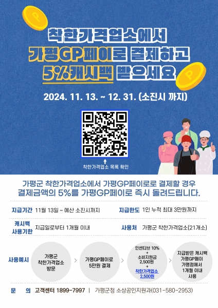 [금요저널] 오는 11월 13일부터 가평군 내 착한가격업소에서 지역화폐인 가평GP페이로 결제하면 최대 20%의 할인 혜택이 주어진다.