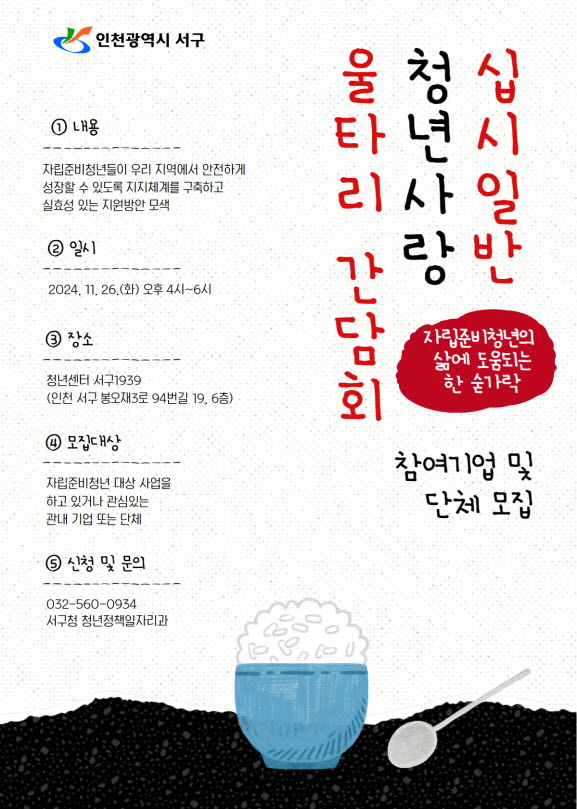 [금요저널] 인천 서구는 오는 26일 화요일 오후 4시부터 6시까지 청년센터 서구1939에서 ‘십시일반 청년사랑 울타리 간담회’를 개최한다고 밝혔다.