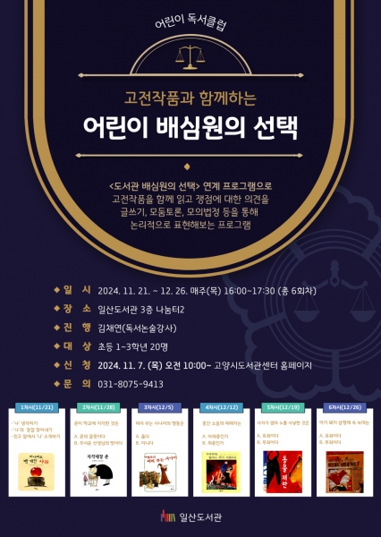 [금요저널] 고양특례시 일산도서관은 11월 21일부터 초등 1~3학년 20명을 대상으로 고전작품과 함께하는 ‘어린이 배심원의 선택’을 운영한다고 밝혔다.