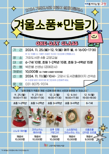[금요저널] 고양특례시 가좌도서관은 오는 11월 25일부터 12월 9일까지 총 5회에 걸쳐 매주 월요일과 수요일에 어린이 원데이클래스 ‘겨울소품 만들기’를 운영한다고 밝혔다.