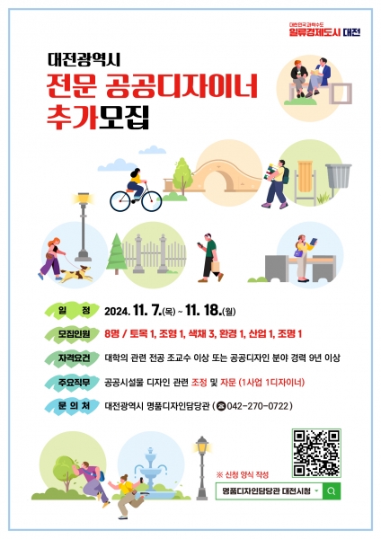 전윤식 대전시 명품디자인담당관은 “명품디자인 도시 대전을 조성하고 공공디자인을 통해 도시경쟁력을 높이는데 기여할 전문 공공디자이너 추가모집에 많은 관심과 참여를 부탁드린다”고 말했다.