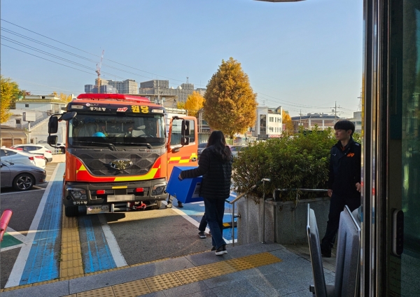 이날 화재 발생 상황에 따라 △화재 상황 전파와 119 신고 △소방 발신기 작동 △직원, 민원인 대피 유도 △주요 물품 반출 △소화기 사용 및 작동 교육 △응급환자 이송 등 실제 상황을 가정한 교육과 훈련을 진행했다.