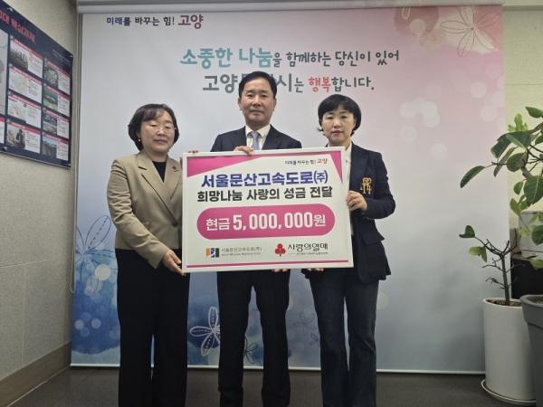 장우종 부사장은 “서울문산고속도로를 이용하는 고양시민과 지역사회에 보답하는 마음으로 올해로 3년째 성금을 전달하게 됐다 앞으로도 고양시의 어려운 이웃을 돕기 위해 꾸준히 노력하겠다”고 밝혔다.