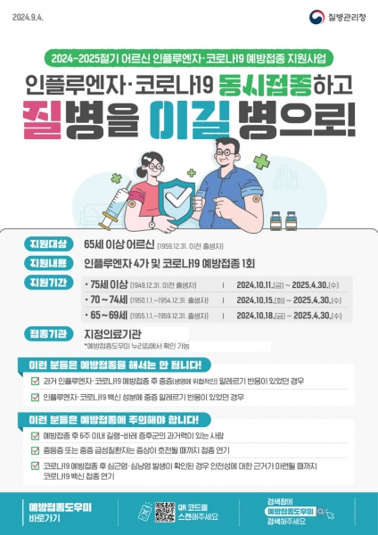 만 65세 이상 미접종자는 주소지 관계없이 2025년 4월 30일까지 전국 위탁 의료기관에서 인플루엔자 및 코로나19 동시 접종이 가능하며 만 60~64세 취약계층 인플루엔자 무료 접종 대상자는 주소지 관할 보건소를 방문해야 접종할 수 있다.