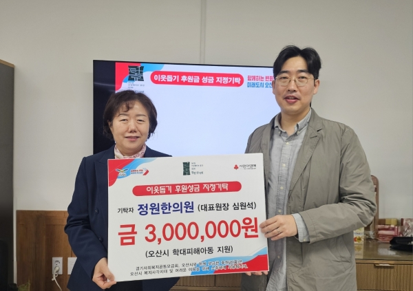 [금요저널] 오산시는 정원한의원에서 지난 12일 관내 학대피해아동 지원을 위해 지정후원금 300만원을 쾌척했다고 전했다.