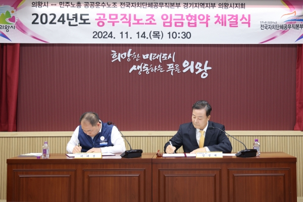 [금요저널] 의왕시는 지난 14일 시청 중회의실에서 공무직 대표노조인 공공운수노동조합 전국자치단체공무직본부 경기지역지부 의왕시지회와 2024년 임금협약을 체결했다고 밝혔다.