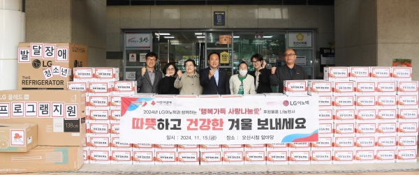 [금요저널] 오산시는 지난 15일 LG이노텍에서 발달장애 청소년 방과후·방학 프로그램 운영을 위한 가전제품과 저소득 취약계층을 위한 김장김치 10kg 178박스를 전달했다고 밝혔다.