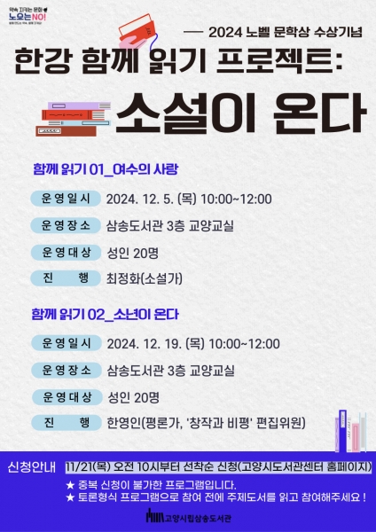고양시삼송도서관, ‘한강 함께 읽기 프로젝트: 소설이 온다’ 프로그램 운영