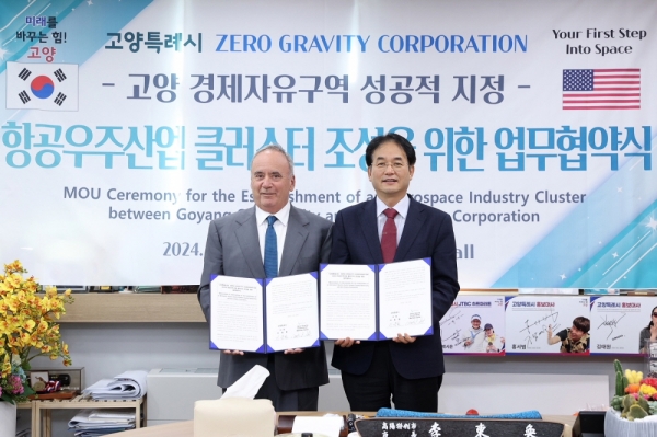 [금요저널] 고양특례시는 지난 18일 미국의 제로 그래비티 코퍼레이션과 고양 경제자유구역 지정 협력 및 항공우주산업 클러스터 조성을 위한 업무협약을 체결했다고 밝혔다.